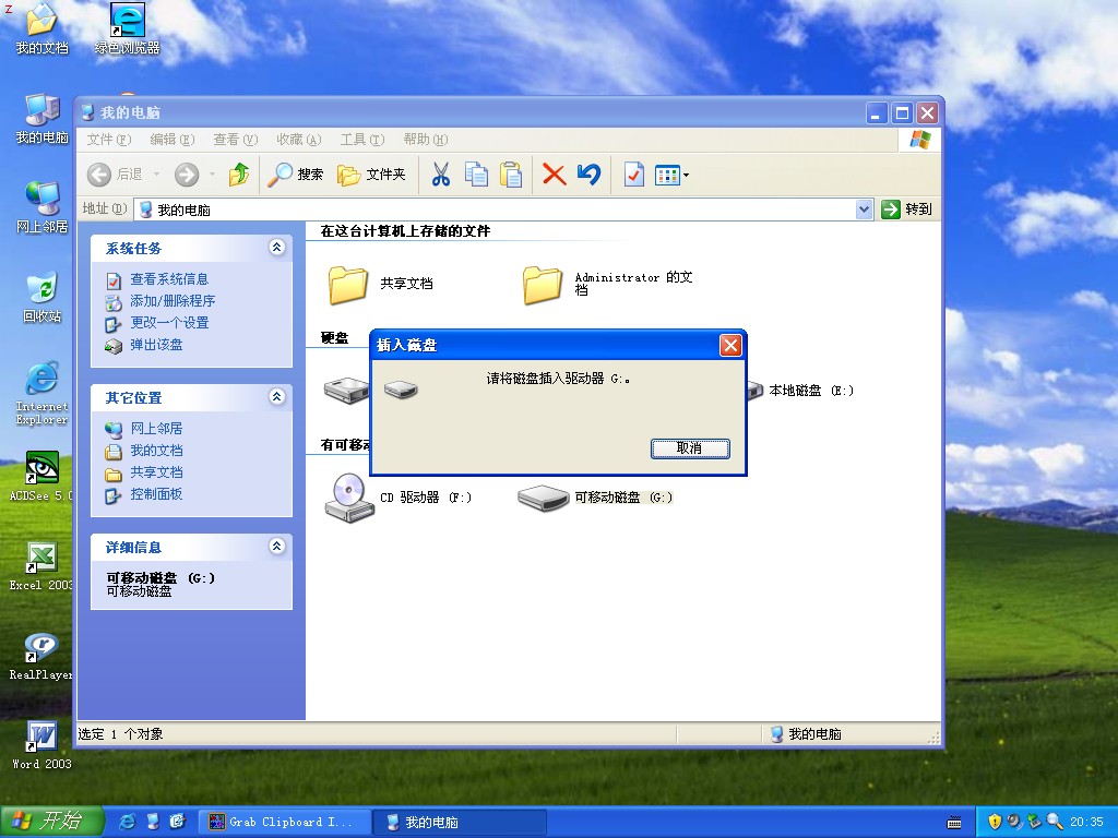 我的U盘在打开时,出现“请将磁盘插入驱动器G:”