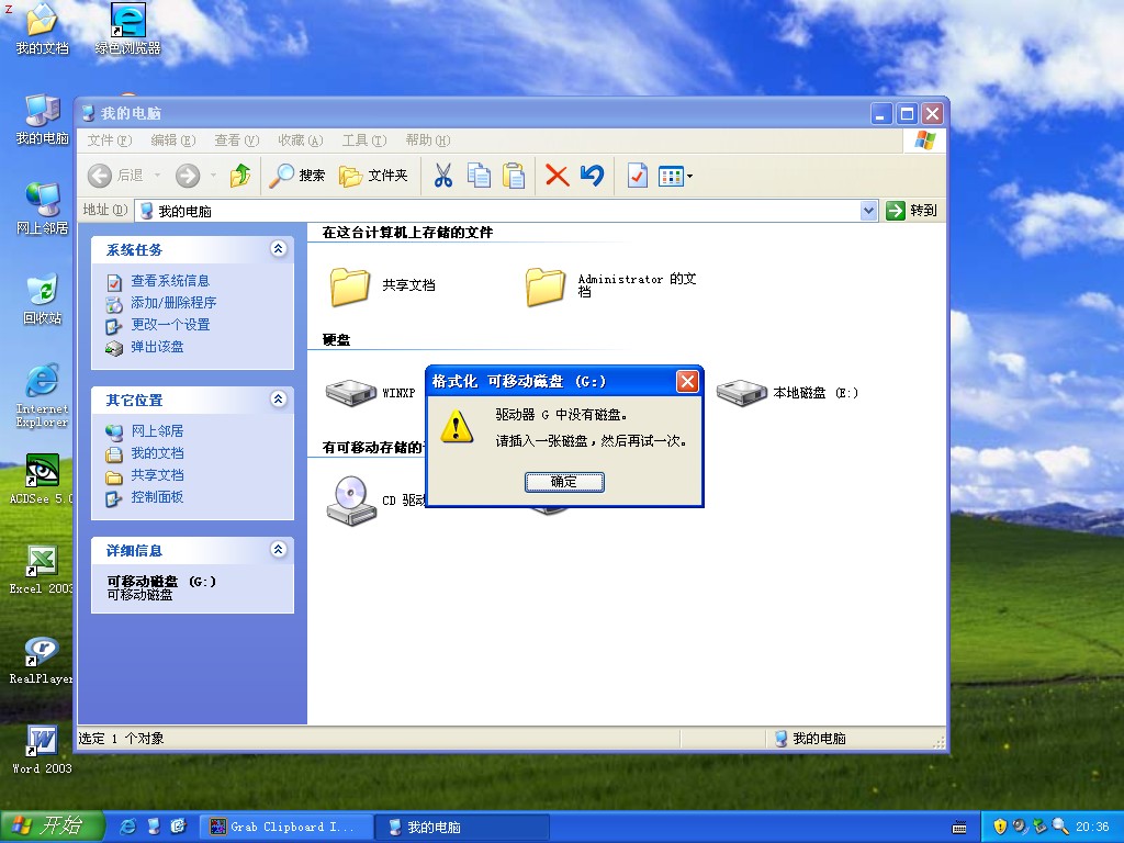 在格式化时,出现“驱动器G:中没有磁盘。请插入一张磁盘,然后再试一次。”