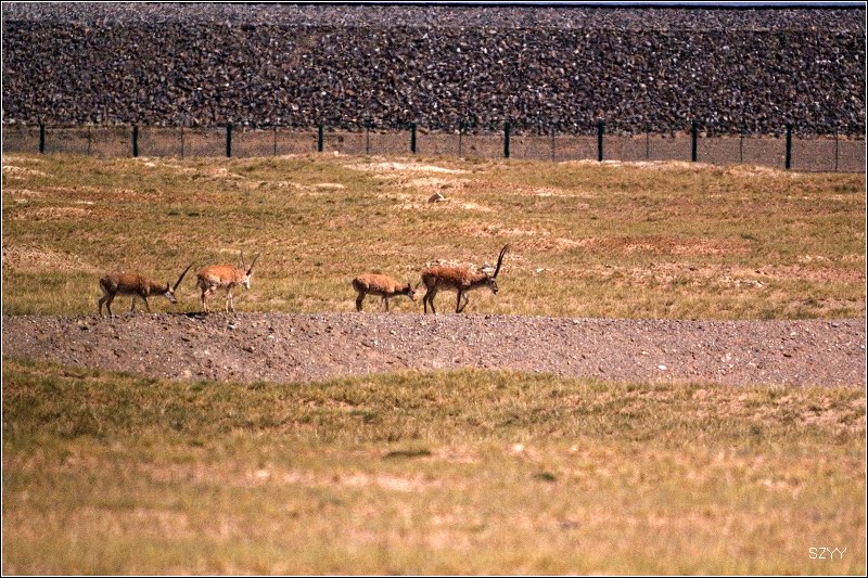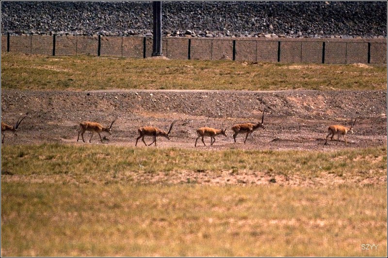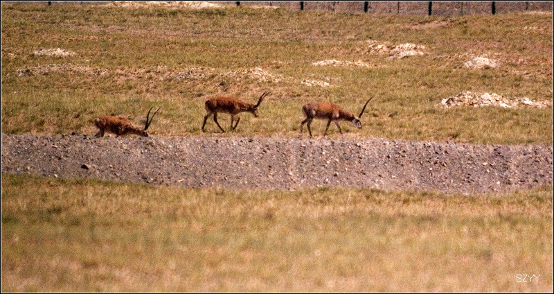 我们立刻放下车窗玻璃,先是一阵快门声,先拍下来再说,第一阵快门扫射以后,那些藏羚羊仍然不慌不忙地边吃草边走,我们这才下车,支起脚架开始第二轮快门扫射,羚羊越走越远,我们这才收起脚架和相机。总算是皇天不负有心人,我们终于看到藏羚羊了,而且我们居然还拍了下来,虽然离的很远,但总是比拍不到强多了。这下大家满足了,继续向昆仑山进发。