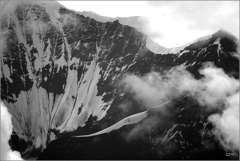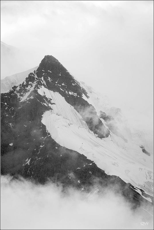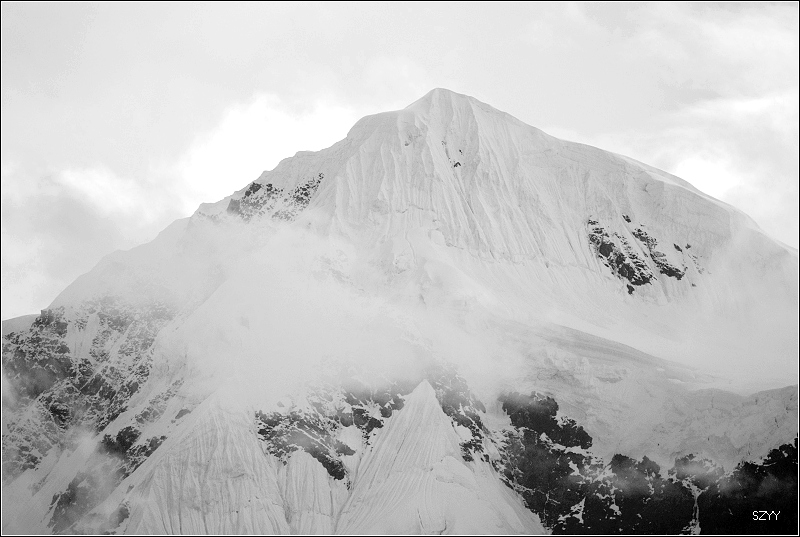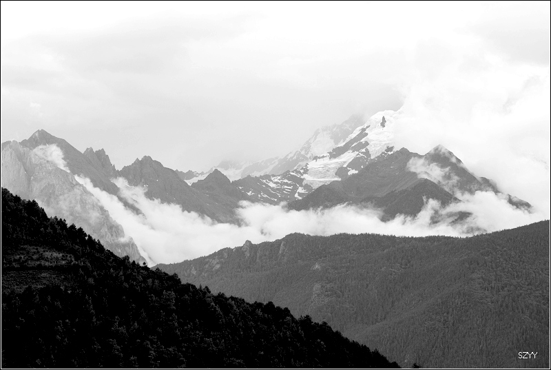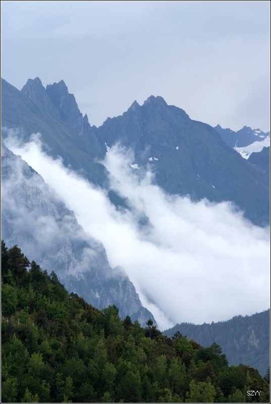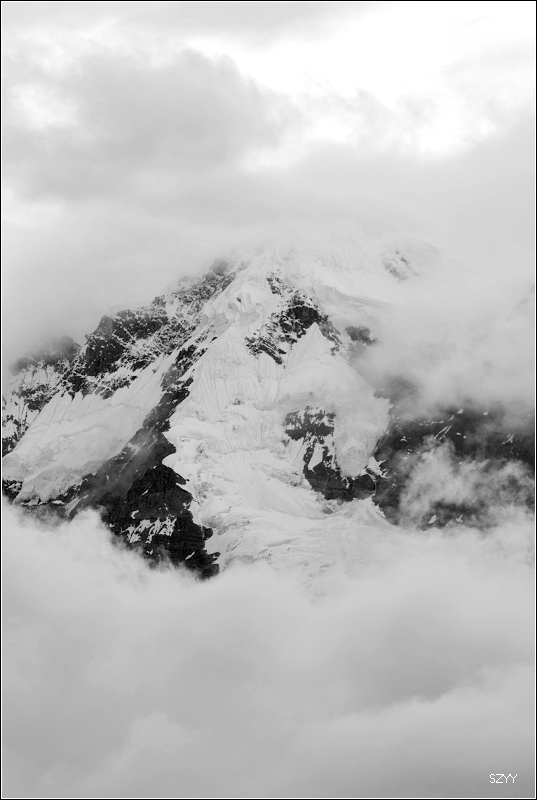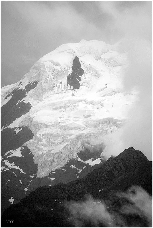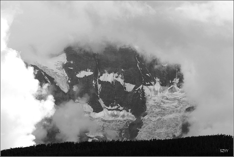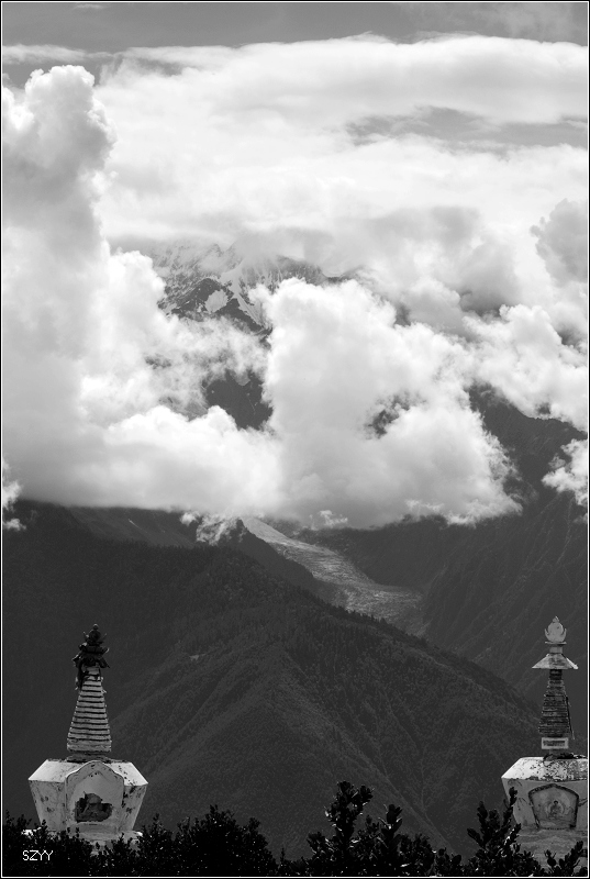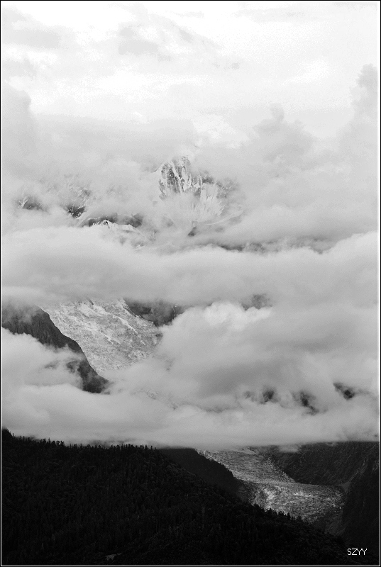 梅里雪山云雾笼罩,主峰卡瓦格博是最后一座没有人类染指的雪峰。卡瓦格博是藏传佛教的八大神山之首,是藏传佛教的朝拜胜地,在当地文化里,山有自己的生命,有着不能染指的圣洁。在蒙蒙细雨中,我们支好脚架,等待拍摄时机,希望我们有好运气。远处的明永冰川朦朦胧胧。昨天来了一个日本旅游团,什么都没看到,一直下雨,据说只要有日本人来,神山就下雨,云雾笼罩。1991年1月3日中日登山队在攀登卡瓦格博峰时遭遇雪崩,17名队员全部遇难,成为世界登山史上的第二大山难。1996年11月,中日联合登山队再次攀登,最后以神秘原因而失败。我们看到了镌刻91年遇难队员名单的纪念碑,日本人的名字全部被刻划或涂抹掉了,当地藏民是很反感他们的,我没有拍照。 就在今年5.1,还有几位深圳的驴友在此遭遇雪崩,不幸遇难。