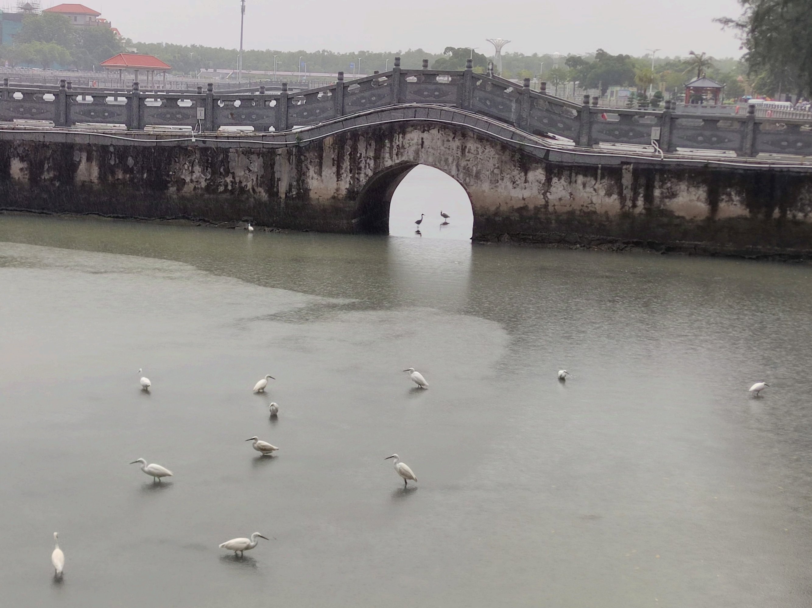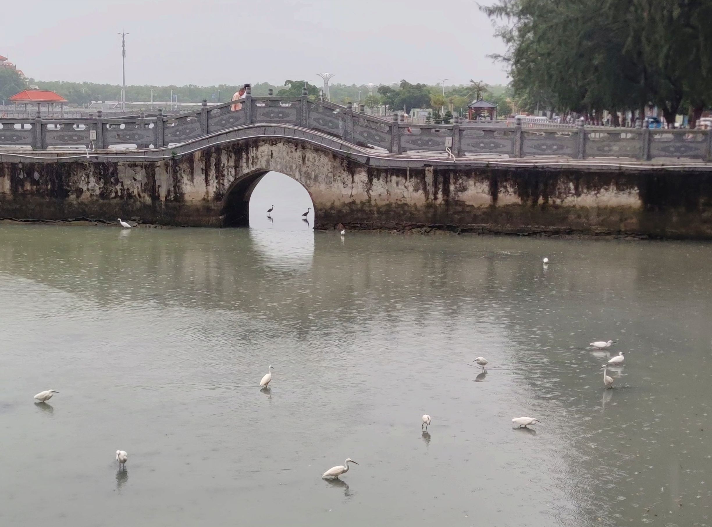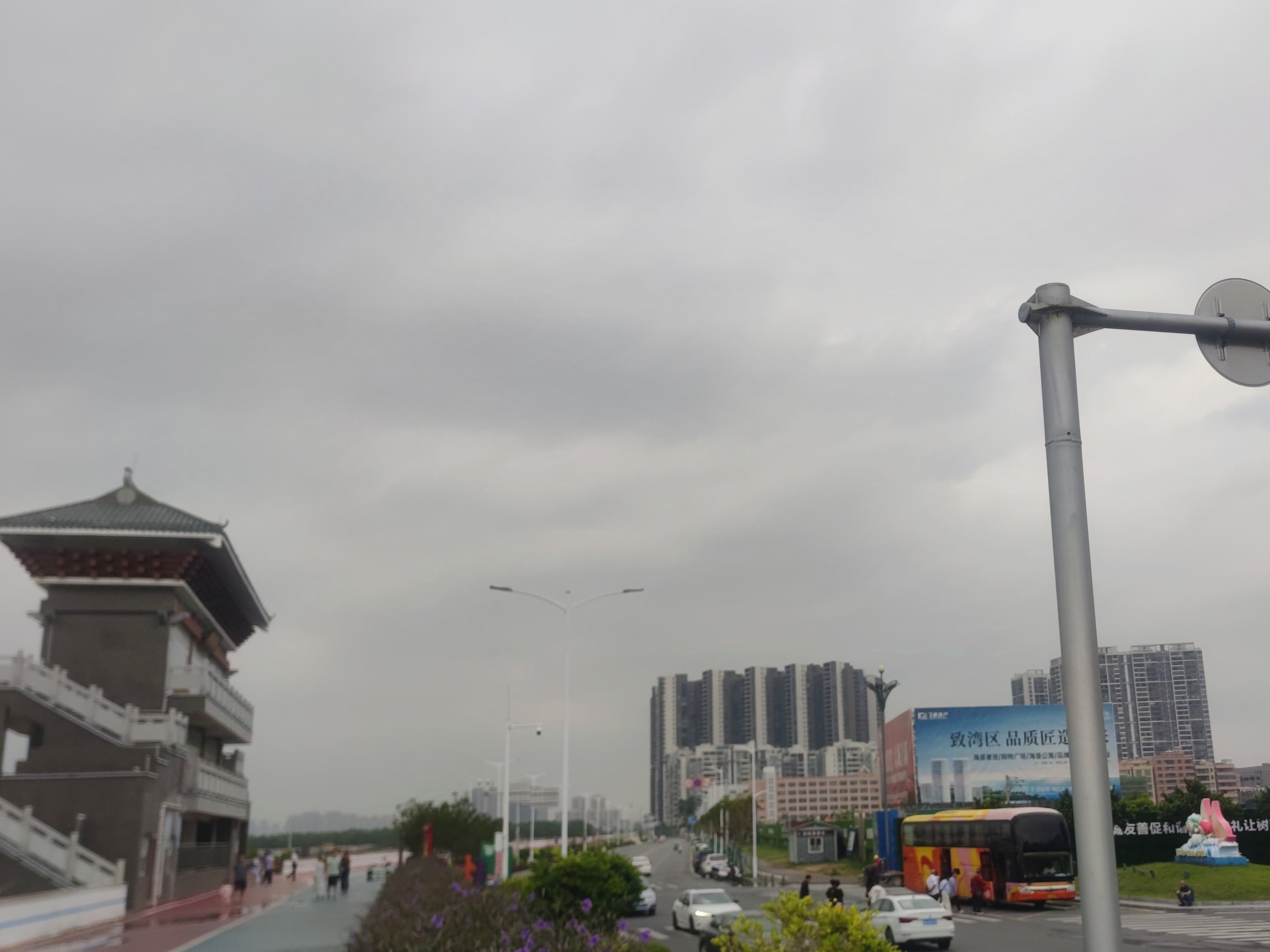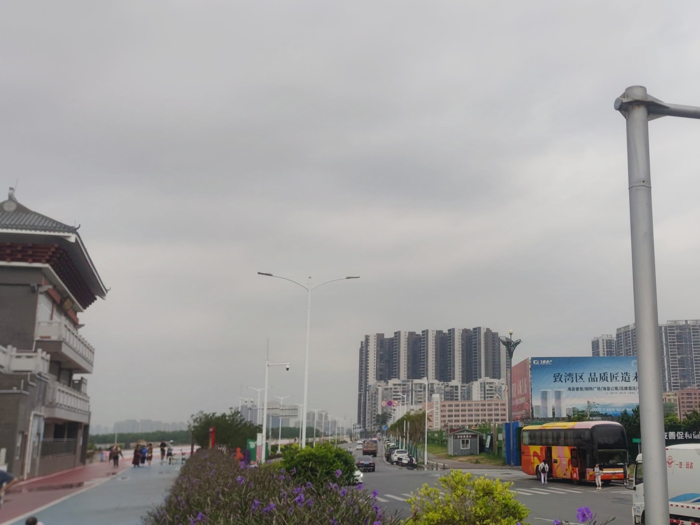 再晚些时,雨点微微停了下,骑行过海堤观鹭阁这边,见有旅游大巴的到来~