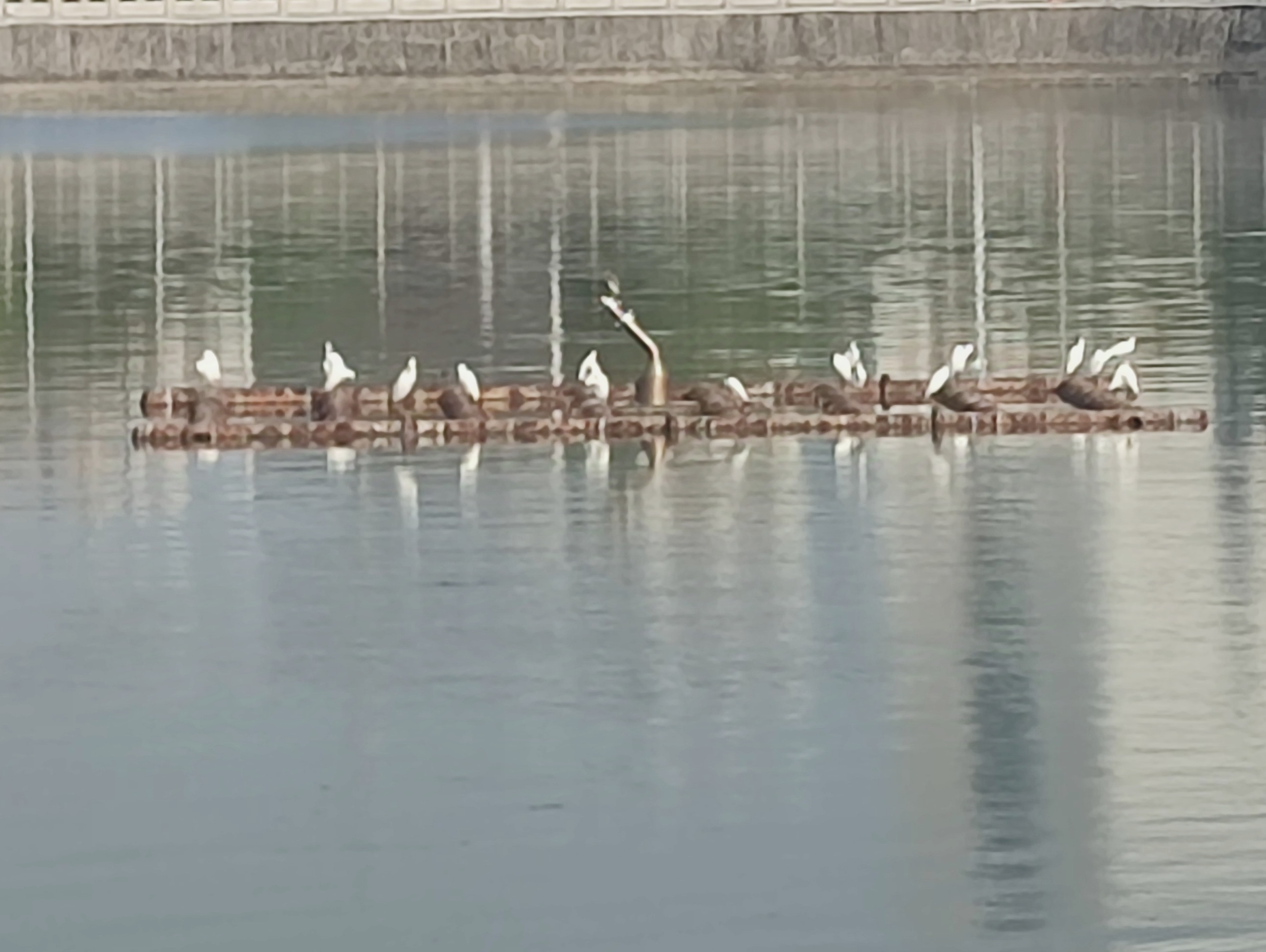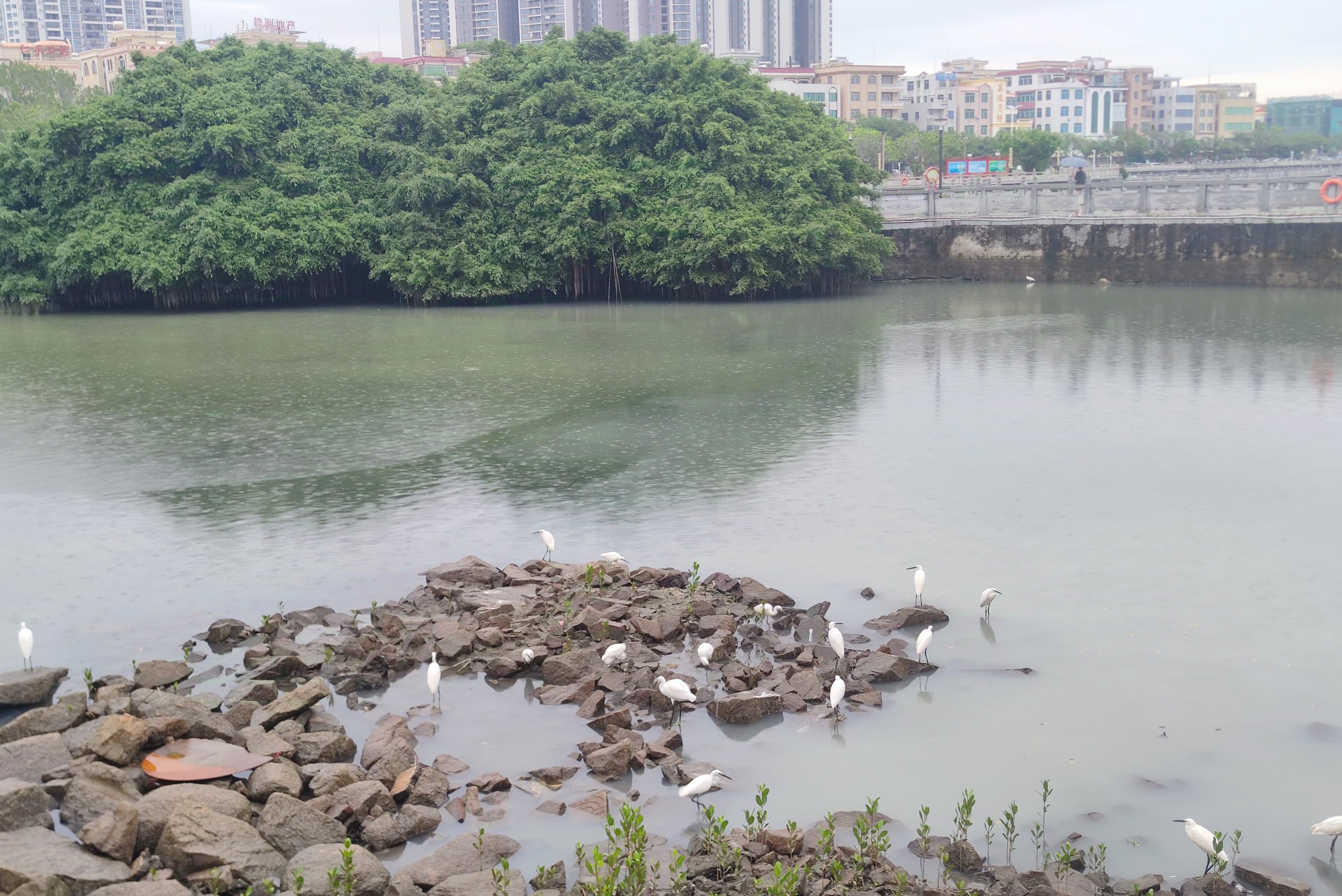 湖的另一端,有好多鹭鹭等鸟儿,在堤围边~