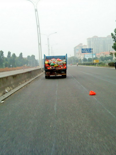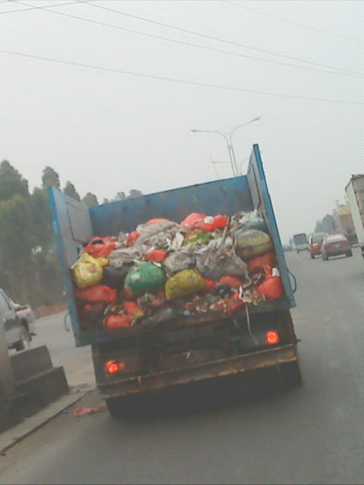 一路见此垃圾车在车后掉垃圾,汗颜