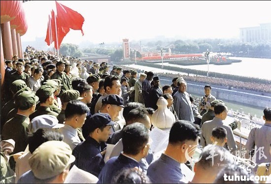1966年8月18日,毛泽东首次在天安门接见了红卫兵,由此掀开了红卫兵运动,文革初期,毛泽东8次接见红卫兵,接见人数超过了1200万。(来源:凤凰网历史)图为红卫兵小将正在为毛泽东带袖章,其他领导人均已带上袖章,唯独刘少奇未带。右四为林彪,右五为周恩来。