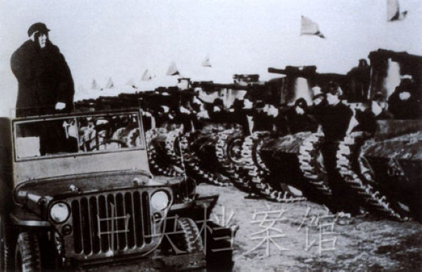 1949年3月25日,毛泽东在西苑机场检阅中国人民解放军坦克部队。