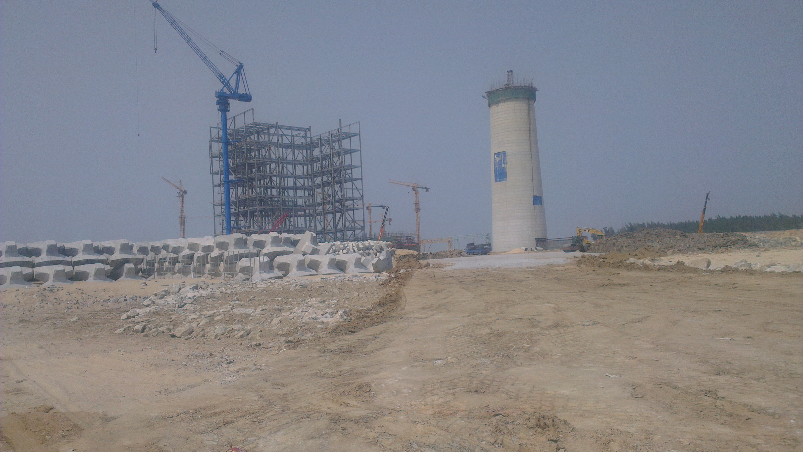规划中的煤电厂已经动工兴建,老李说:图中的铁架是电厂主机的机架,右边圆柱形的是排污的烟囱。