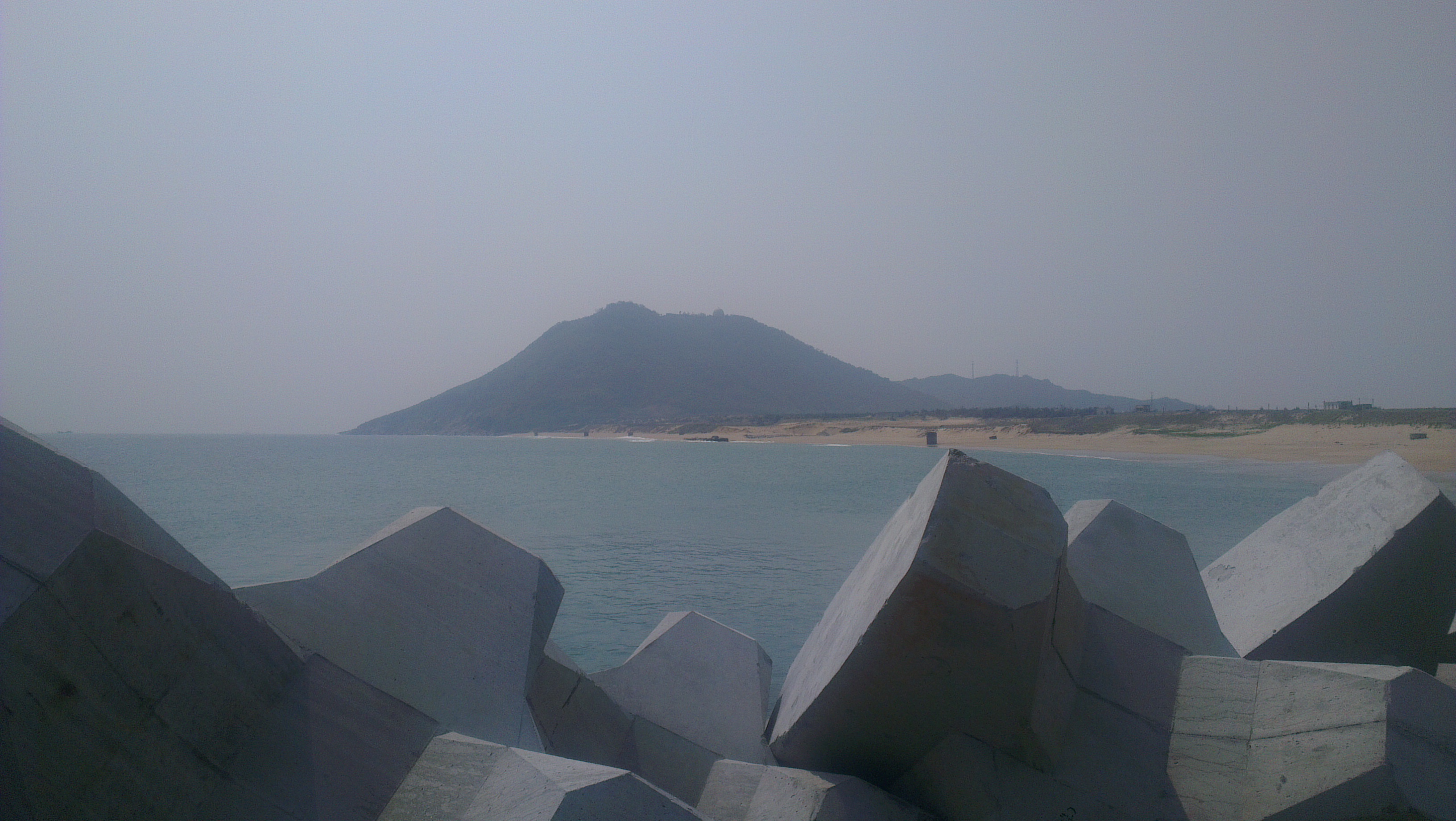 图中小山叫莲头岭,海拔250多米,两峰并峙状若莲花并蒂,位居电白县旧八景之二的“莲岭青屏”就是这两个小山。右边岭脚白色的是一道建设中的东防波堤,近处堆满石头处是西防波堤,两道防波堤延伸相接围起的海域将被填平,往后就是堆放煤炭等大宗货物的的码头